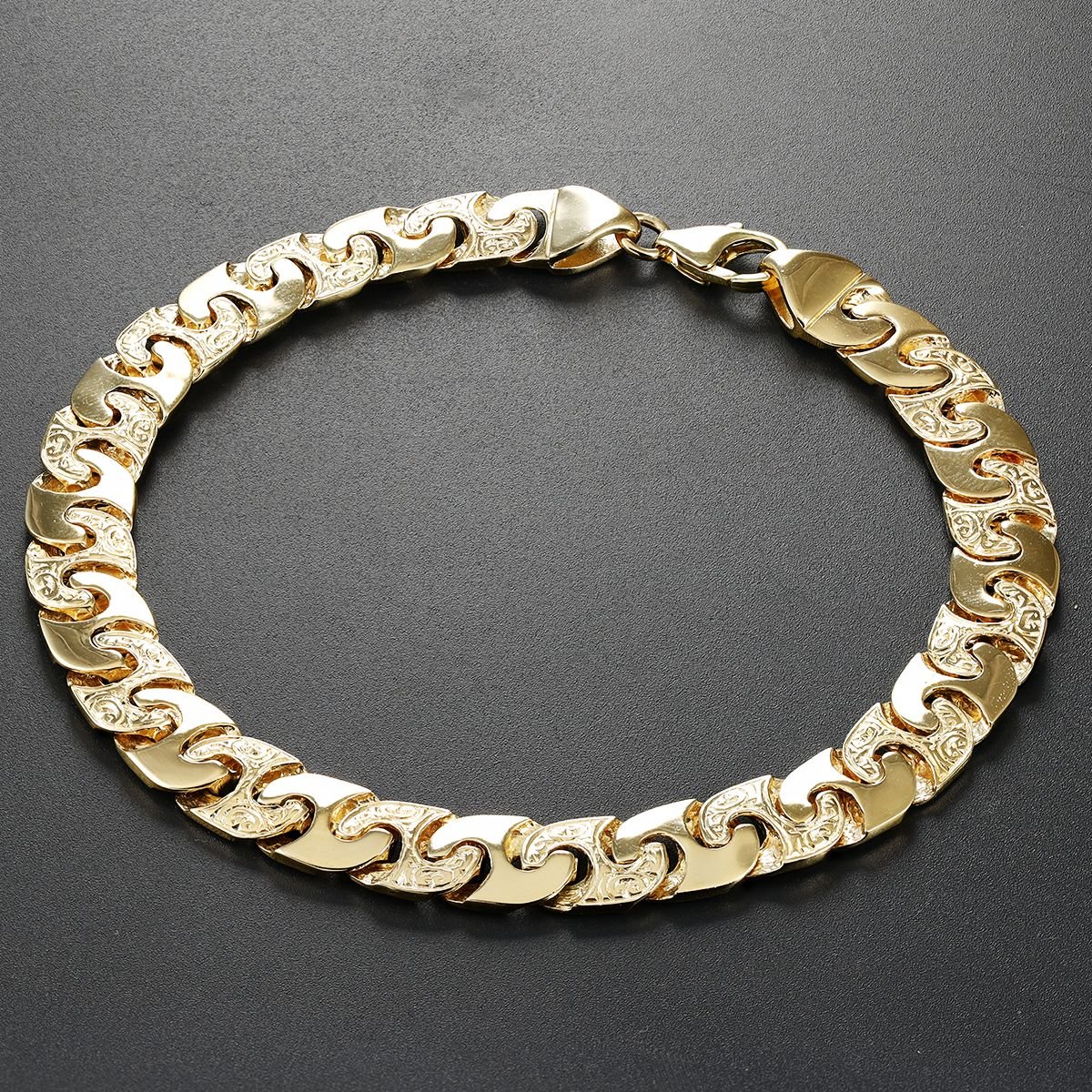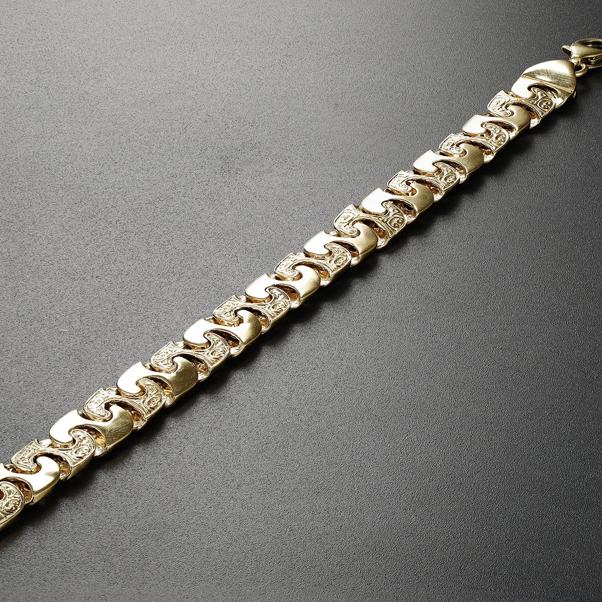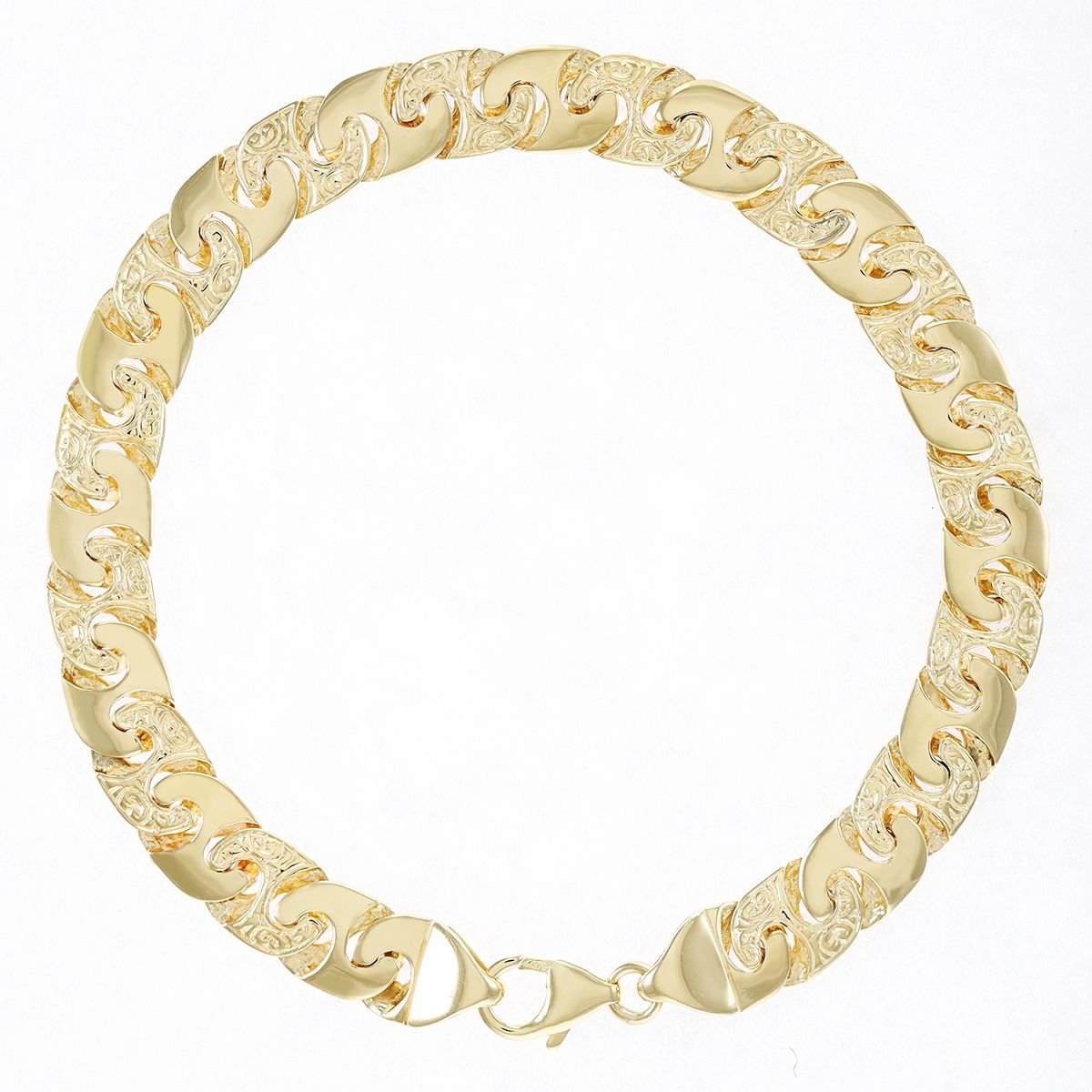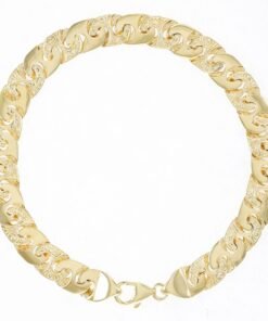 This stunning, ornately patterned, mariner bracelet is crafted from 9ct yellow gold. Featuring a solid structure with alternating polished and ornate links, this is one of our smaller sizes in our mariner bracelet range. Each link measures 8.5 mm in width with a thickness of 2mm. Complete with a full UK hallmark to confirm the purity and a strong parrot clasp with a polished, high shine finish.